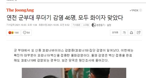 연천 군부대 무더기 감염 46명, 모두 화이자 맞았다 : 네이버 뉴스 (naver.com)