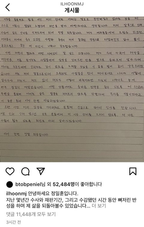 이해 못할 상황도 아니고 참 얼마나 세상 꼬아서 생각하고 사는건가 솔직히 어이도 없고 좀 그래... 얘들아 지금 쟤가 정일훈 잘했다고 저러는거 아니잖아 쓰니야 너가 보기엔 프니엘이 지금 정일훈 잘했다고 옹호하는거같이 보여? 톡선 올라갈 이슈거리처럼 보여서 신나? 너야 재밌다고 낄낄거리면서 글올리고 문제될거같으면 쓰윽 지우면 끝인듯하지만 결국 네 글로 누군가는 상처받아. 이러한 너는 어떤 사람이니? 좋아요는 용서를 비는것에 대한 격려차원일뿐이고 이 상황에 대해 그 누구도 설명하려는거 없이 그저 쉬쉬하려는점도 정말 너무 개탄스럽다. 덕분에 내 크리스마스는 작년이나 올해나 개판이 된 거 같지만 그래도 너네는 메리크리스마스 해라!!