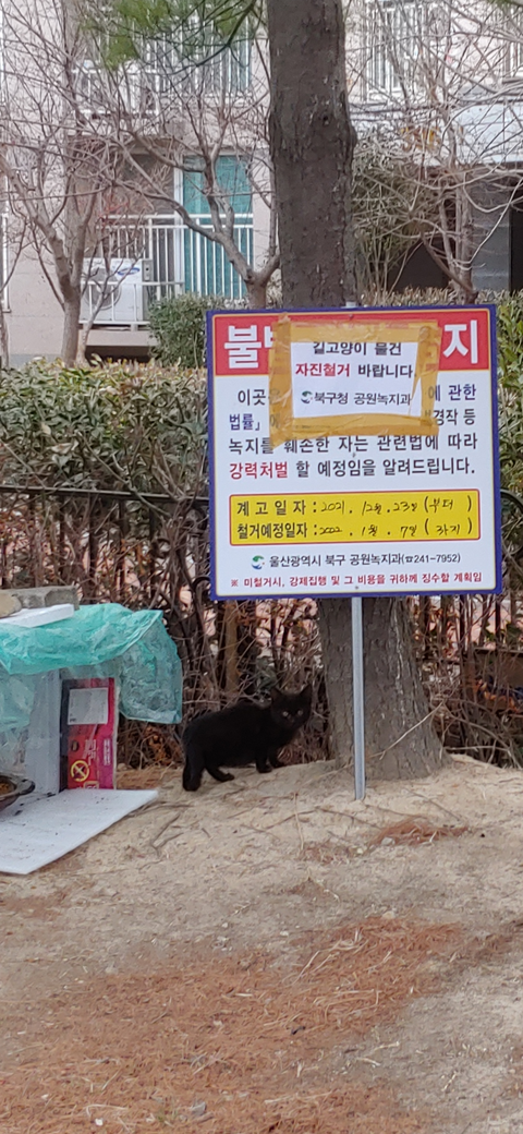 그런데 오늘, 길을 지나가다 철거 예고 안내판을 보게 되었다. 안 그래도 추운 겨울에 이제 먹을 사료와 물조차 없게 될 불쌍한 고양이들...