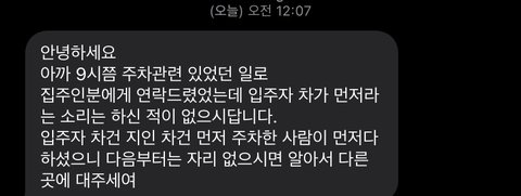 그러다 자려고 누웠는데 12시7분에 문자옴 ㅋㅋㅋㅋ집주인한테 전화해서 물어봤는데 그런말한적없고 거주자던 지인이단 먼저대는사람이 대는거라했다라면서 앞으로 주차할때없음 딴데대라고 문자가옴
