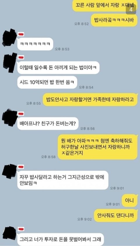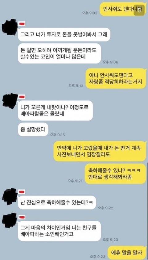 같은 일을 해서 한쪽은 안 좋은 일 당하면 언급을 자제해야 배려고 친구 아니냐? ㅋㅋㅋㅋㅋ 한번 축하 받았으면 됐지, 약은 다 올려놓고 한마디 하니 배아파 하는 거래 어휴 저게 인간인가