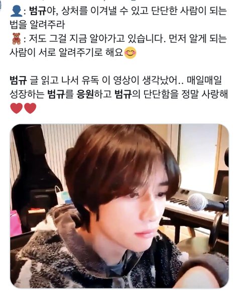 범규 올해 진짜 단단한사람이 되었잖아 단단해지는 법을 스스로 터득한 범규가 아직까지 단단해지지못한 모아들에게 이제는 알려줄수 있을것 같아