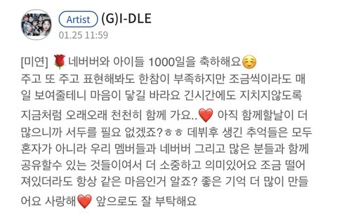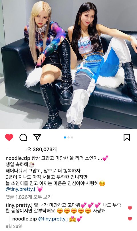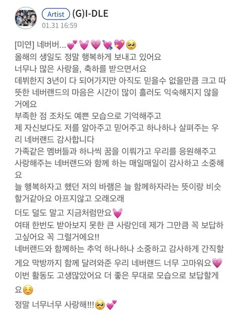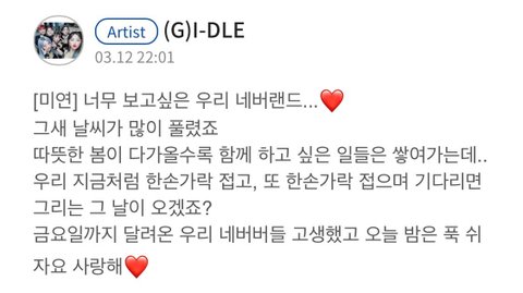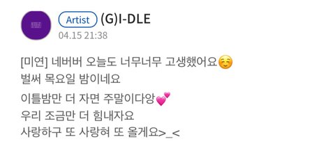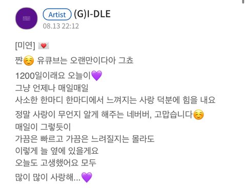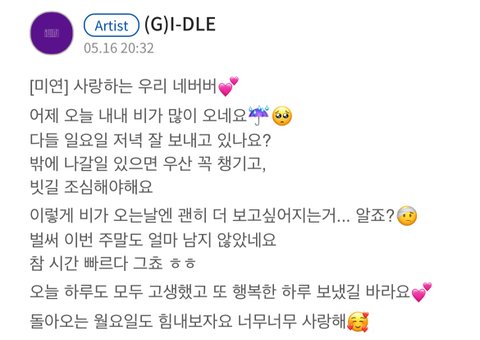 그리고 우기도 중국에서 열일하느라 수고 많았고 소연이도 올 여름 신나게 보낼 수 있게 해줘서 고마워 민니랑 슈화도 아이들 파이팅 곧 컴백하는데 빨리 보고시퍼 많이 응원해주라ㅠㅠ!