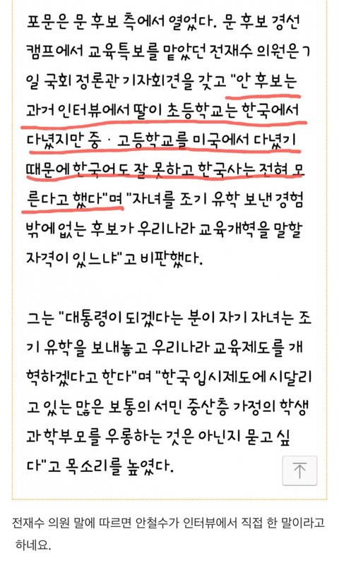저번 대선 안철수가 떠오르자 민주당은 안설희(안철수 딸)에 대한 무차별 폭로를 시작했었다. 그중에 젤 황당했던 게 안설희가 한국말을 못 한다는 거였다. 결국 안설희는 유투브 영상으로 본인의 한국말(?) 증명해야 했고 민주당은 잘하면 된거네요라고 넘어감 ㅋ