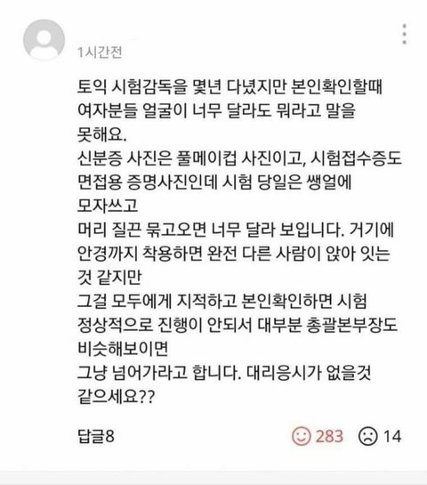 진짜 염병들좀 하지마셈. 톡선에 올라와있는 와 화장 차이 개미쳣다 글에 올라온 사진임ㅋㅋㅋㅋ 저렇게 화장하고 증사찍고 쌩얼로 시험보러가면 딱보고 알아볼 수 있겠음? 메이크업 전후 유투브 썸넬만 봐도 누구세요? 수준인 사람 수두룩한데 여기서 감독관을 왜욕함ㅋㅋㅋㅋ 증명사진이 왜필요한데? 그 사람을 판단하고 다른 사람의 위장 식별 등을 목적 으로 필요한거임. 풀메이크업에 포샵들어간 증사 붙여놓고 쌩얼로가서 왜 못알아보냐 염병하는게 일부 여자들 잘못이지 감독관 잘못이냐? 증사는 흐린눈으로 봐도 본인이여야지, 무슨 이목구비위치 하나니하나, 귀모양까지 뜯어봐야 알 수 있는게 정상임? 같은 여자라고 편들고 무지성 남혐하는것도 정도가 있어야지 양심좀 챙겨ㅋㅋㅋㅋㅋ 그냥 딱 봤을때 식별 애매하다 싶으면 퇴실 당해도 할말 없어야지