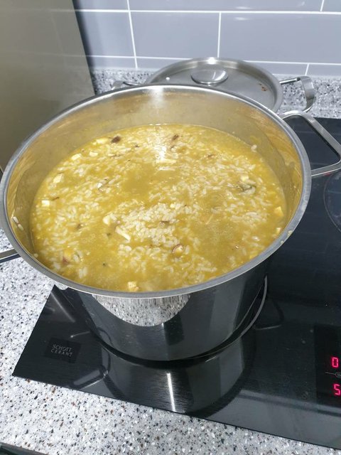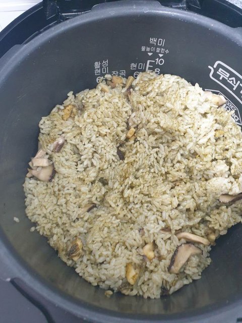 밥솥에 볶은 내장과 쌀을 넣고 전복 넣고 표고버섯 넣고 참치 액젓 한큰술 넣어줘요.