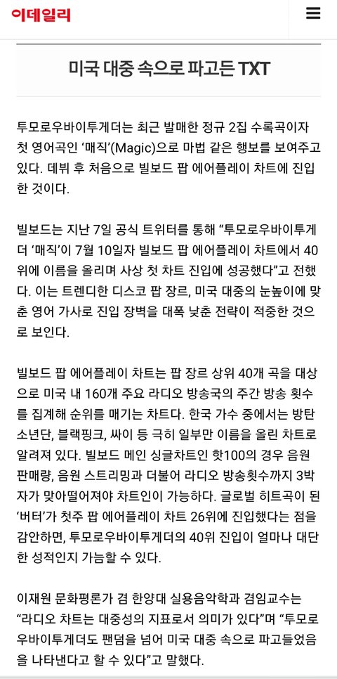 빌보드 팝 에어플레이 첫 진입했을때 기사내용 7월초에