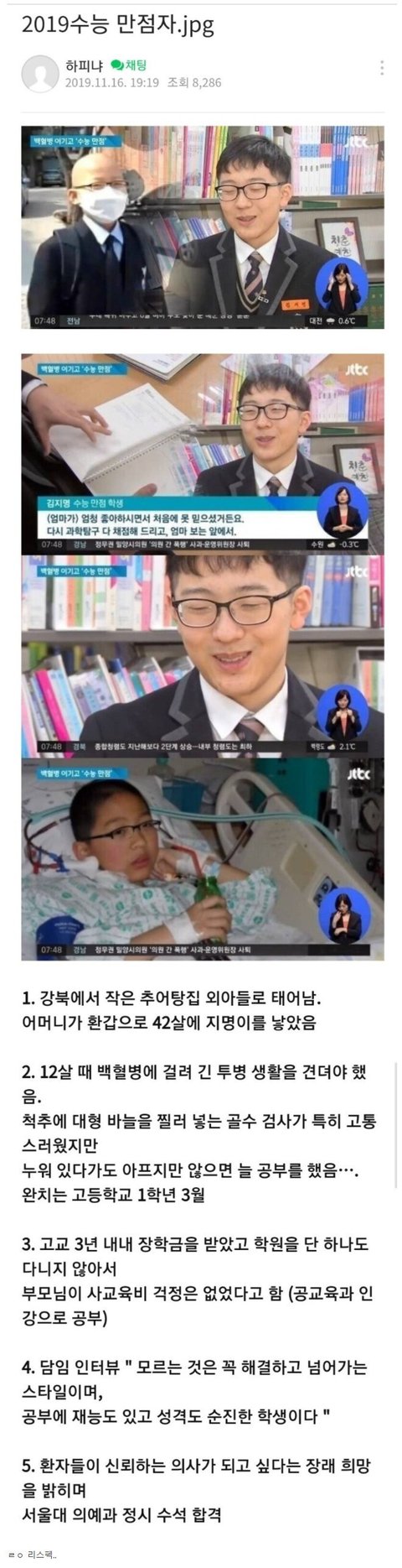 22회 백혈병.. 2019년 수능 만점자 레전드