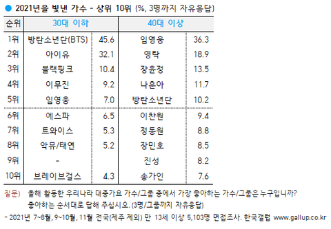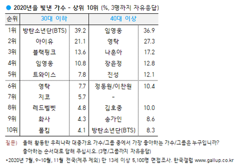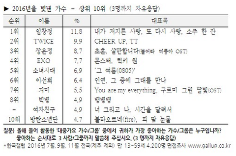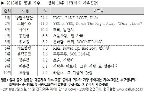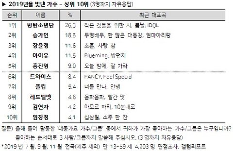 블핑은 갤럽순위 탑10에 이름조차 없음
