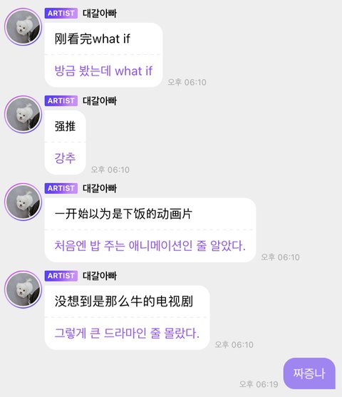 아까 친구랑 슴 욕하다가 버블이 와있길래 그래서 버블확인하면서 짜증나라고 말하면서 무의식적으로 그대료 쳐서 보냄 ㅋㅋㅋㅋ... 보내자마자 놀래서 호다닥 다른내용 보냄 ㅋㅋㅋㅋ 러러한테 짜증나라니 하... ㅠㅠㅠㅠㅠㅠ