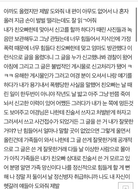 오늘 경찰 분들이랑 같이 진술서 쓰고 문자로 사건접수 됐다고 왔거든 …. 근데 이거 취소 할까 그냥 ..? 여경님이랑 대화 나눠보고 여경님이 이건 오빠도 경각심을 가지게 해야 된다고 진술서 쓰고 처벌받게 하자고 하셨지만 지금 생각해보니까 너무 두려워 .. 아직 가족들은 몰라 내가 진술서 제출한지.. 부모님이랑 오빠 벌써 내가 신고했다는 거 자체에 날 정신병자로 생각해 나 근데 갑자기 무서워 너무 크게 일이 벌어지면 어떡하나 싶고 정말 어떡하지 취소해 아니면 그냥 계속 싸워..? 근데 나 정말 지금 너무 무섭고 두려워