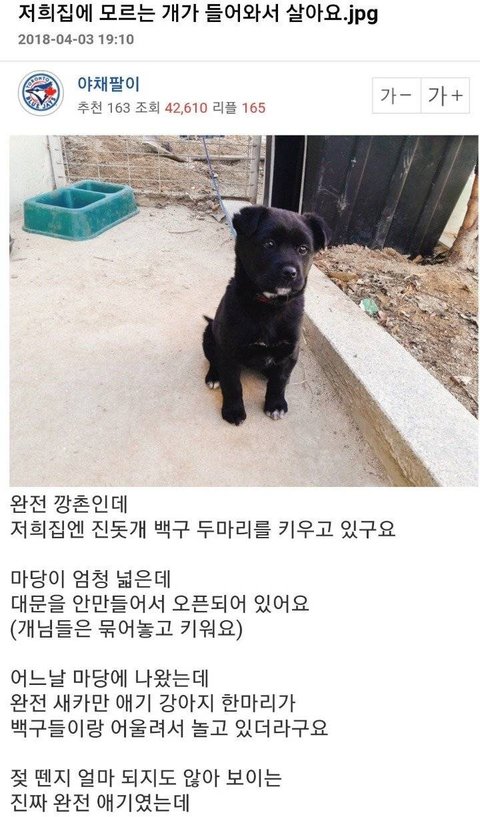 뭔개소리임 시골집 특히 대문없는집 개풀어놓고 키우면 개장수가 꼬셔서 납치해감 우리친정집 개 세마리 잃어버림 그뒤로 묶어둠 개가집나갔냐고? 우리집 두세시간거리에있는 산에 풀어놔도 집찾아오는 완전 똑순이 똑돌이들이였음(엄마랑 하루한번 내걸음으론 왕복5시간. 엄마걸음으론 하루세시간거리 산산책다니심 산책나갈때 줄로 안묶고 풀어서나감 산이 사유지라 사람없음) 묶어둔개는 절대 손안댐 그건 백퍼 절도죄니까. 알지도못하면서 개소리 지껄이지마셈
