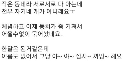 도시 사람들 생각에 묶는 게 학대다 싶겠지만 시골 살아보면 왜 묶게 되는지 알 듯. 개장수는 개 도둑질해가지 대문 밖으로 개들 나가면 이웃집 민폐지.. 집 안에서 풀어논다 해도 개들 집 안에서 잘 돌아다니지도 않음. 집은 아무리 넓어도 어차피 자기 공간으로 생각해서. 젤 좋은 건 풀어놓고 키우는 거지만 여건 안돼서 어쩔 수 없이 묶는 개들도 많음