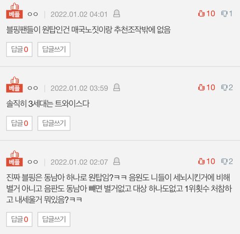 블핑팬들은 대상0회 음방1위처참 갤럽처참 총판처참 음원처참 연간순위 처참 개뿔도 없는 기록에도 불구하고 동남아 빨 초동,뮤비조회수로 자기들이 3세대 최종승자라고 우기고 있습니다