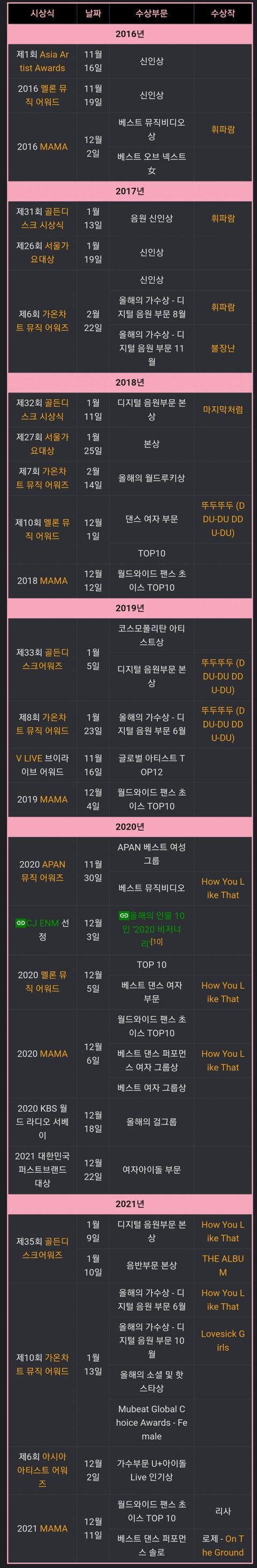 헐? 원탑걸그룹 블핑의 수상내역을 전부 찾아봐도 대상의 대짜도 찾을수가 없네요?ㅗ