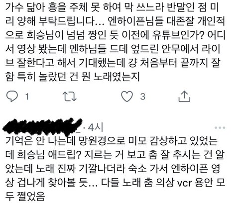 찾아보는데 타팬이 써주신 후기 보니까 라이브 엄청 잘했나봐 위버스콘 보면서 애들 라이브 잘한다 잘생겼다는 말만 반복했는데 실물 후기도 좋고 기분 좋음 팬톡에 위버스콘 다녀온 엔진은 없나ㅠㅠ (원글 링크 남김)