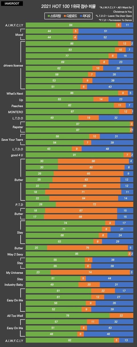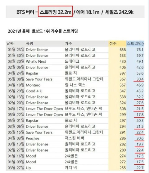 버터전에 2021년 빌보드 1위들 스트리밍 수치를 봐 알못이 나대네 버터 스트리밍도 상당히 잘나왔음 ㅈㅂ아