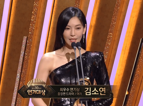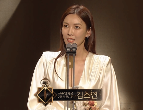 김소연은 “28년 전에 보조출연자로 시작했다. 그 작품이 SBS 드라마였는데 이렇게 SBS에서 엄청나게 큰 상을 주셔서 믿어지지 않는다. 내가 이 상을 받아도 되는 건지 죄송하고 송구스러운 마음이 든다”고 고백했다. 그는 주동민 감독과 김순옥 작가를 비롯한 제작진과 스태프, 동료 배우들에게 감사 인사를 전함