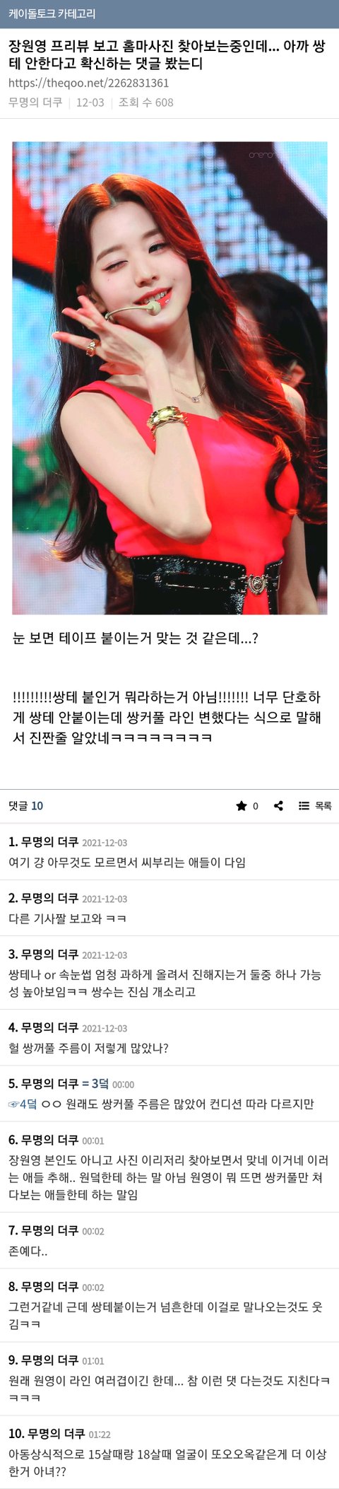 왜 안티들이 악의적으로 비교한 사진만 믿고 쌍수 했다고 확신 하는지 모르겠음. 지금 장원영 안티들은 노래 춤 표정 성형 등등 온갖 루머 만들면서 광적으로 프레임 씌우고 까질 하던데