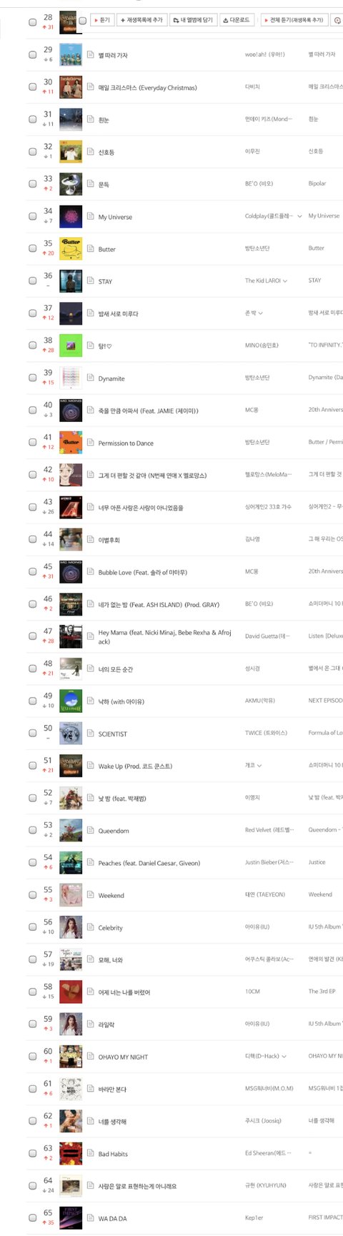 사진은 벅스 실시간 차트인데.. 우아가 더 높음