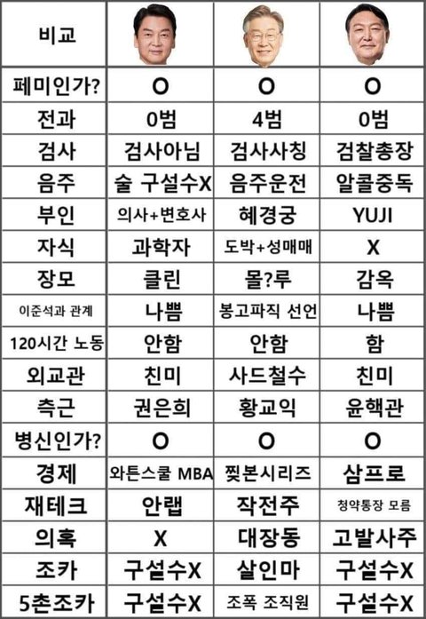 왜 셋다 페미임?ㅋㅋㅋㅋㅋㅋ 윤석열은 아무생각없는 새끼라 패밀리즘 ㅇㅈㄹ떨고 이재명은 유명한 형보수지╋강간범 변호╋오피스 누나 제목끌린다 ㅇㅈㄹ떨고 안철수는 관련 입장 밝힌적도 없는거같은디