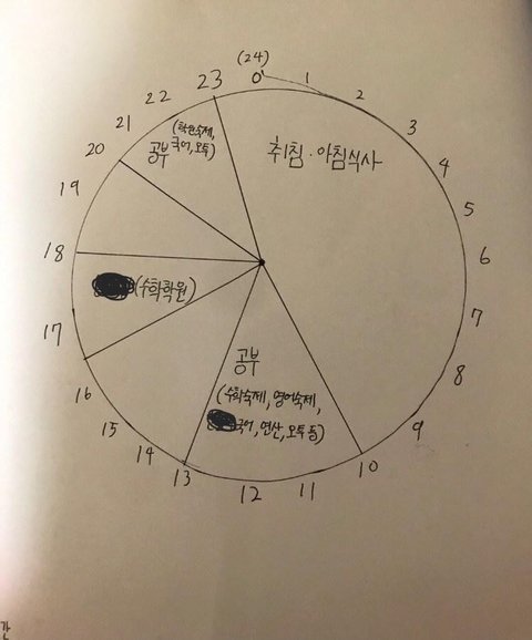 와 동그란 시간표 개오랜만..... 초딩때 여름방학 숙제 밀린거 급하게 할때 저거 꼭 만들었었는데