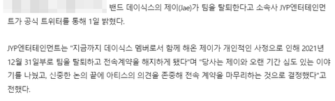 "회사와 논의 후 죄송하게도 저는 잠시 데이식스 활동을 쉬어가야 할 것 같다는 의견에 도달했다"