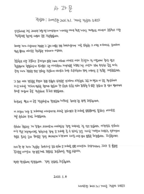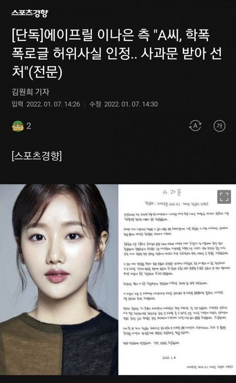 [단독]에이프릴 이나은 측 "A씨, 학폭 폭로글 허위사실 인정.사과문