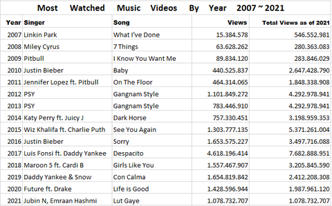 역대 유튜브 최다 조회수 뮤직비디오