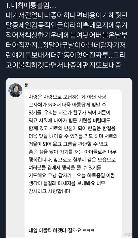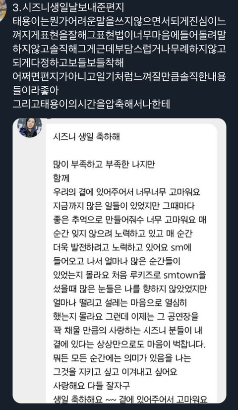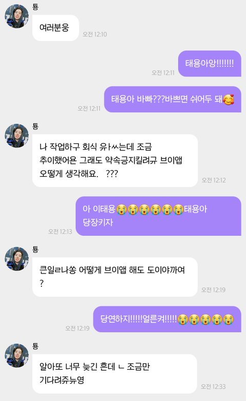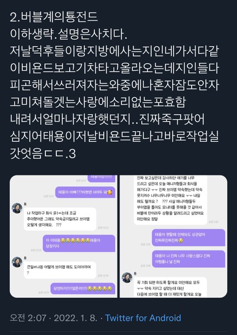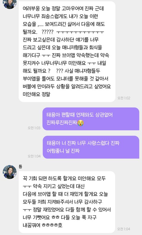특히 저 두번째는 2020비욘드때 태용이가 집에가서 라이브 켜주갰다고 약속하고 취해서 못올거같다고 미안하다고 버블온거ㅜ 그 다음날 바로 라이브켜서 미안하다고 하고ㅜㅜㅜ사랑한다