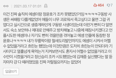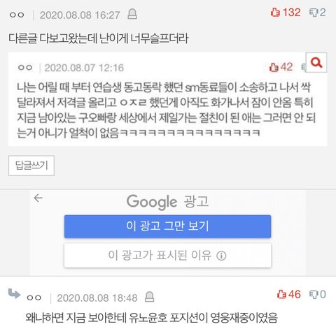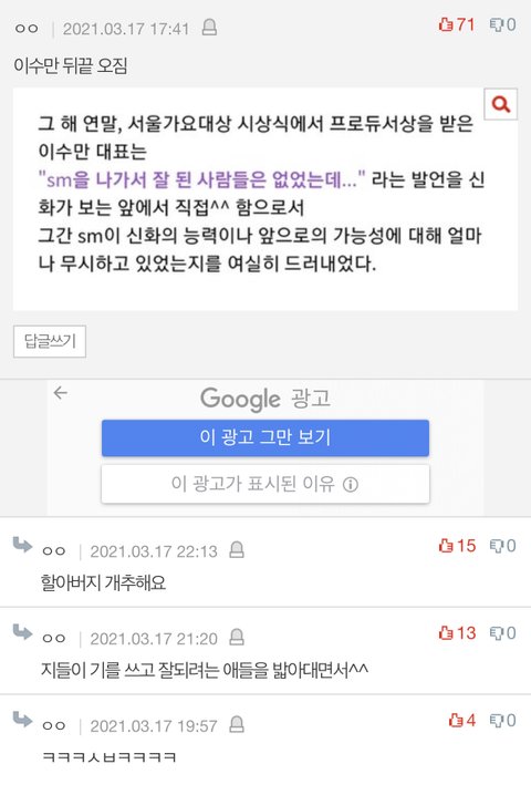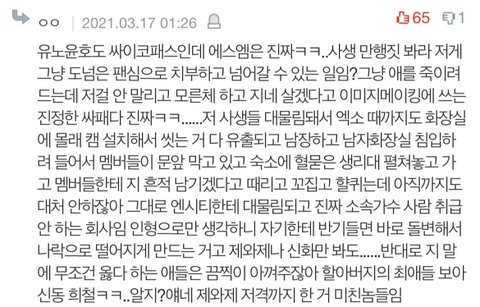 늦덕인 나도 이렇게 화가 나는데 김김 오랜 팬들은 진짜 몸에서 사리 나올 듯 하.. 솔직히 나도 알기 전에는스엠 좋은 소속사라고 생각했었어 전에 스엠 소속 남돌을 좋아하기도 했고 가족 같은 분위기가 좋았으니까