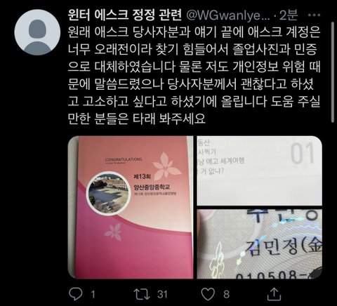 당사자분께서 인증 다 하셨습니다. 당사자분께서 불쾌하시다고 하시고. 에스크 계정이 너무 오래되어서 찾기 힘드시다고 민증, 졸업사진으로 대체하셨습니다.