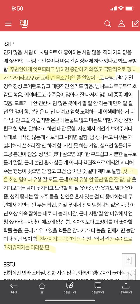 여태까지 18년 동안 본 mbti 글들 중에 제일 잘맞음 ㅅㅂㅋㅋㅋㅋㅋ 특히 형광펜 친 부분 보고 무릎 팍 쳤다