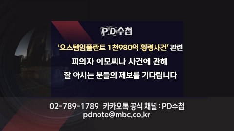 PD수첩에서는 오스템임플란트 1,980억 횡령사건 관련 피의자 이모씨나 사건에 관해 잘 아시는 분들의 제보를 기다립니다.
