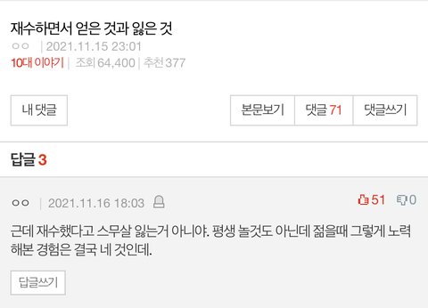 20살 때 못 놀아서 20살을 잃엇다고 생각하는 사람도 잇구나 ㅋㅋㅋ…… 평생 놀기만 할 거임? 아니 ㅅㅂ 논 경험 vs 또 한 번 도전해 본 경험 도대체 뭐가 더 값지다고 생각함?