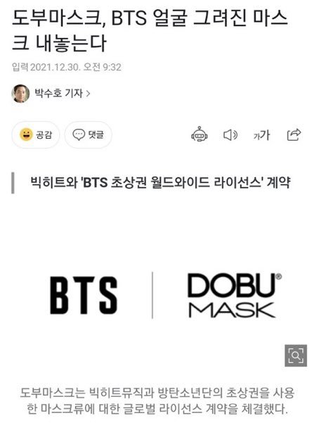 [베플 1] 저 마스크는 하이브에서 파는 공식 굿즈가 아님 빅히트가 도부마스크라는 업체랑 방탄 초상권 사용 계약 체결해서 나온 상품임