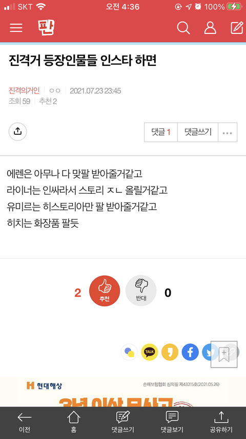 리바이가 팔로워 제일 적어야함. 왜냐면 누가봐도 안할거같아서 찾아보지도않고 찾아보더라도 게시물이 없어서 사칭 계정인줄 알거임.