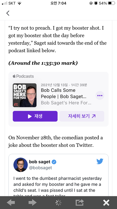 MRNA 코로나 백신을 홍보하고 다니시던 미국의 배우 밥사겟 님이 부스터 샷을 맞고 나서 몇일 뒤에 운명을 달리하셨네요.