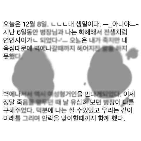 오늘은 12월 8일. ㄴㄴㄴ내 생일이다. —_아니야ㅡ- 지난 6일동안 병장님과 나는 화해해서 전생처럼 연인사이가ㄴ 되었다-‘ㅡ 오늘은 내가 죽지만 내 욕심때문에 벽에나갈때까지 헤어지잔 말을 하지 못했다.