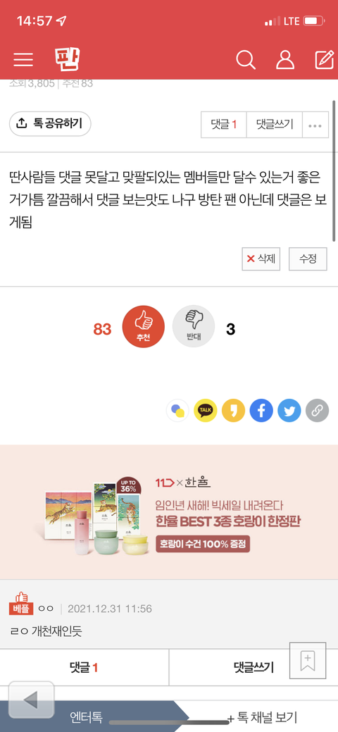 몇주전에 방탄 인스타 보고 글 썻는데 추천수는 83인데 왜 댓글은 1개 밖에 없냐 아미들은 보고 추천만 누르고 댓글은 잘 안달아..? 아니면 보고 흠~ 좋아~ 이러고 넘겨…?ㅋㅋㅋ 귀엽네