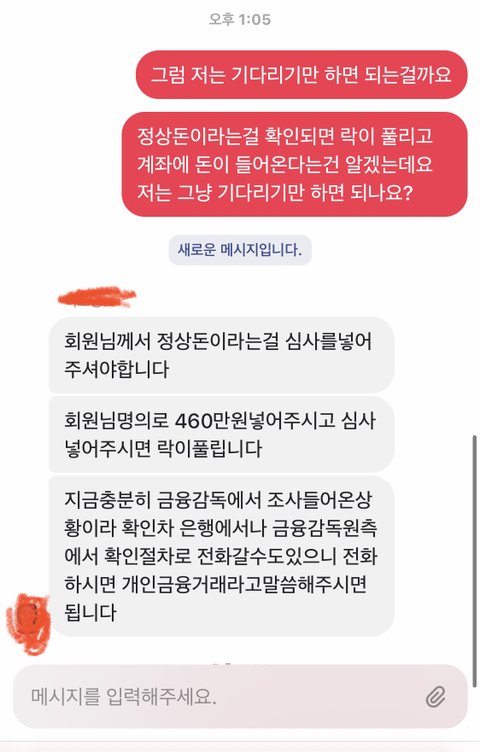 카톡을 하다가 갑자기 (1월 12일) 자기가 옛날에 어느 사이트에 ( 프*한 19) 돈을 엄청 충전했는데 그게 기간만기로 다음날에 다 소멸된다는 거임 근데 그 가격이 무려 2500만원 ; 그 돈을 환전해서 받을려했는데 안된다고 함; 근데 그걸 받은 사람은 15% 떼어서 받을수 있다 함. 그 남자분이 그러면서 과거는 과거일뿐이라면서 그 돈을 받아서 가지고 한우를 사달라는 거임; 조카 고민했음 사이트부터 구경해봄 보니까 익명처리가 되어서 남녀가 채팅하는건데 남자가 미션을 내주면 여자가 그걸 하면 코시?? 포인트를 갖게 되는거임 거절을 할까 하다가 저렇게 큰 금액인데 버리긴 너무 아까웠으니 나한테 부탁하는거겠지 싶었음 그 남자는 고객센터 실시간 채팅을 하면서 코시를 바로 환전해서 받을수있다고 말해줌 난 그말을 찰떠같이 믿어버리고 들어감 ; 그래서 코스를 2500만원치 받아냄 그거 환전하려고 하니까 갑자기 안되지는거임;;;; 나도 고객센터에 연락해서 말하니 등급이 있어야 받을수있다네? (동,은,금,vip) 사야된대 2500은 금액이 크기에 금은 사야된다고 함 금 가격이 50만원임 ; ㅋ 이걸 또 사 말아 ; 하다가 그래도 2500 받았는데 환전은 해야지 싶어 50만원 입금함 .. 그래서 또 환전하려니까 또 안된다는거임 퀵환전을 구매해야 환전받을수있다함 ;;; 그 남자분한테 이게 뭐냐고 하니까 같이 양아치네 하면서 미안하다고 함 그래서 30만원 입금함 ;;; 근데 또 금액이 너무 커서 안된다 마지막이다. 오류라서 안된다 돈내라 진짜 마지막이다. 세탁신분일까봐 경고맞아서 풀어야하니 돈내라, 받으려는 금액에 몇프로를 채워야하기 때문에 돈 더내라;;;; 결국 난 저기에 1800만원금 입금함 ;;;;;;; (돈 내는걸 자꾸 하루안에 해결해야된다고 함)