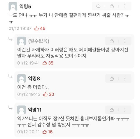 페미언냐들이 에타에서 이렇게 똥글 싸는거 미러링 하는건데 멍청해서 진짜로 저러는줄 아나보네 ㅋㅋㅋ
