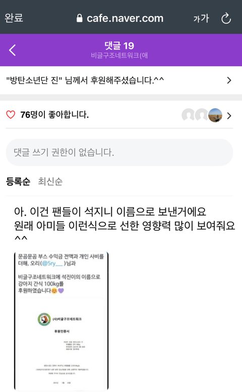 석지니 이름으로 팬이 기부한거랭
