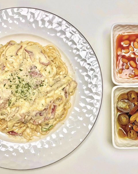 레시피 안보고 요리할 수 있는 몇 안되는 요리중 하나 꾸덕꾸덕 '크림파스타'! 신랑이 체다치즈를 워낙 좋아해서 크림소스에 슬라이스 체다 3장 넣어 같이 끓여주면 고소함이 진한게 맘에 든다며 너무너무 잘 먹어요 ^ ^
