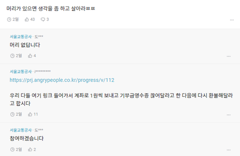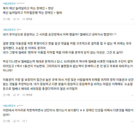 블라인드에서 회사이름 걸고 이성적인척 합리적인척 사회적 약자 혐오하는 서울교통공사..ㅋㅋㅋ 댓글만 봐도 수준 참 잘 보이네요.