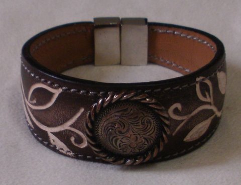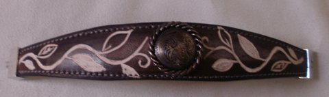 가죽에 넝쿨 나무 디자인을 카빙하고 천연 염색하여 제작한 핸드메이드 가죽 팔찌입니다.(마디샤)