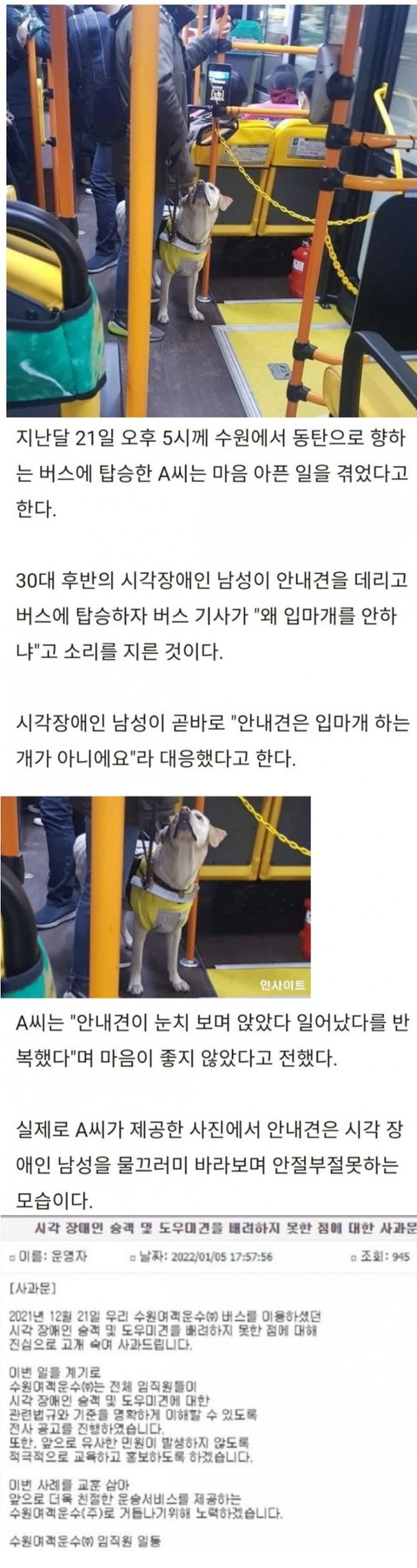 수원 버스 기사 호통에 놀라 눈치보는 안내견