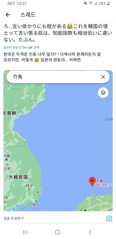 나 트위터에서 반일일본인들이랑 조카 싸우는데 섬숭이들 독도가 어딘지도 모르고 일단 우기는거 개빡침ㅋㅋ 역사날조 및 지네문화 오지게 미화하면서 한국은 날조의 나라, 한국 사극은 99% 거짓말 이런 사상이 나라 전체에 퍼져있는것도 ㅈ같음