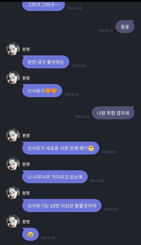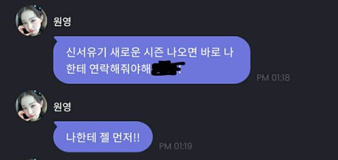 아 너 답장이 ㅈㄴ 킬포야 ㅋㅋㅋㄱㅋㄱㅋㄱㅋㄱㅋㄲㅋㅋ ㅠㅠ 원영이 기엽다 나도 프메 하까