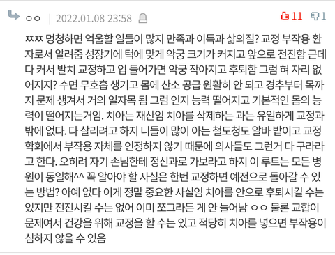 10000% 저 글이 맞음. 밑의 치위생사니 자기가 교정을 해봤니 하는 사람들 말 믿거하고 정말 악궁확장이나 심각한 매복니 덧니 빼고 절대절대절대 교정, 치아삭제, 발치하지 말 것. 저 글 전부가 모두 사실이다. 저렇게 진실을 알리는 사람들이 많아야 해.. 나도 저 부작용 모두 가지고 인생이 굉장히 많이 망가졌고 그로 인해 턱관절까지 문제와서 고통 받고 있고 이런 과정들로 생업도 못하고 자살하는 사람들도 있다. 그런 심한 경우 아니어도 나중에 부작용 반드시 와.